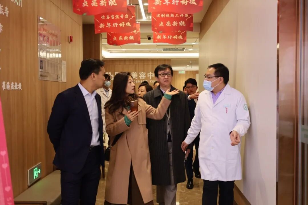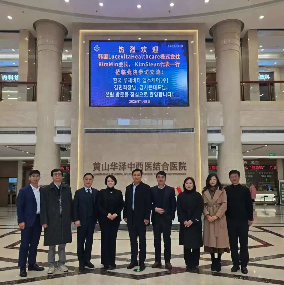 1月8日,在黄山市工商联的引荐下,韩国Lucevita Healthcare株式会社董事长金珉、CEO金时恩一行莅临黄山华泽医院开展实地考察。在医院董事长、院长金永贵及院领导班子的全程陪同下,考察团先后走访了门诊、住院部、“百岁嘉” 健康宣教馆,重点参观了医疗美容科的诊疗环境、设备配置及特色项目开展情况,并前往华泽健康城院藏徽州康养基地实地探访,深入了解基地的康养设施、服务体系及运营模式。此外,考察团还实地调研了院藏徽州周边呈坎等优质旅游资源,直观感受黄山“世界自然与文化双遗产地”的独特魅力与丰厚旅游底蕴。